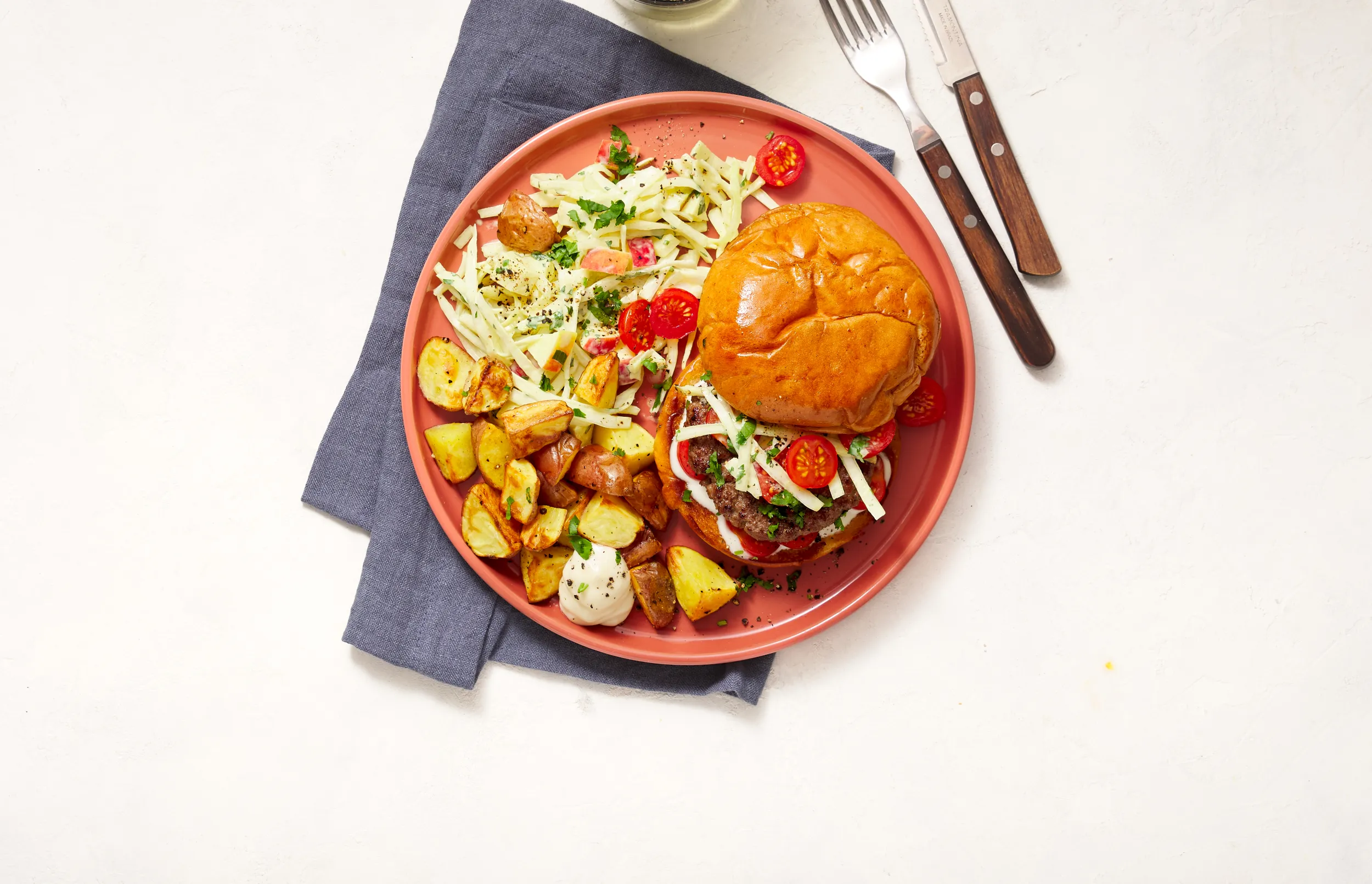 Beleg elk broodje met plakjes cherrytomaat, een burger en wat mayo. Serveer de aardappeltjes en appel-koolsalade erbij.