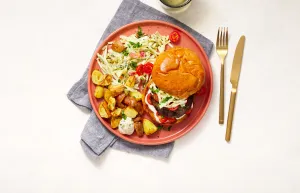 Beleg elk broodje met plakjes cherrytomaat, een burger en wat mayo. Serveer de aardappeltjes en appel-koolsalade erbij.