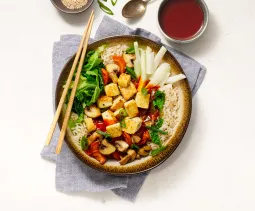 Verwarm olie in een afdekbare wok of hapjespan. Snij ½ stuks gele ui in dunne halve ringen en fruit glazig. Voeg een snuf zout toe. Schil 150 g wortelpeterselie en snij in dunne halve- of kwart maantjes. Bak ca. 5 minuten op middelhoog vuur mee met de ui. Pers de laatste minuut 1 teentje knoflook erbij.