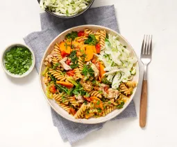 Meng vlak voor serveren de pasta en de kool door de saus. Roer 25 g kaas erdoor en breng op smaak een kneepje citroensap en versgemalen peper.