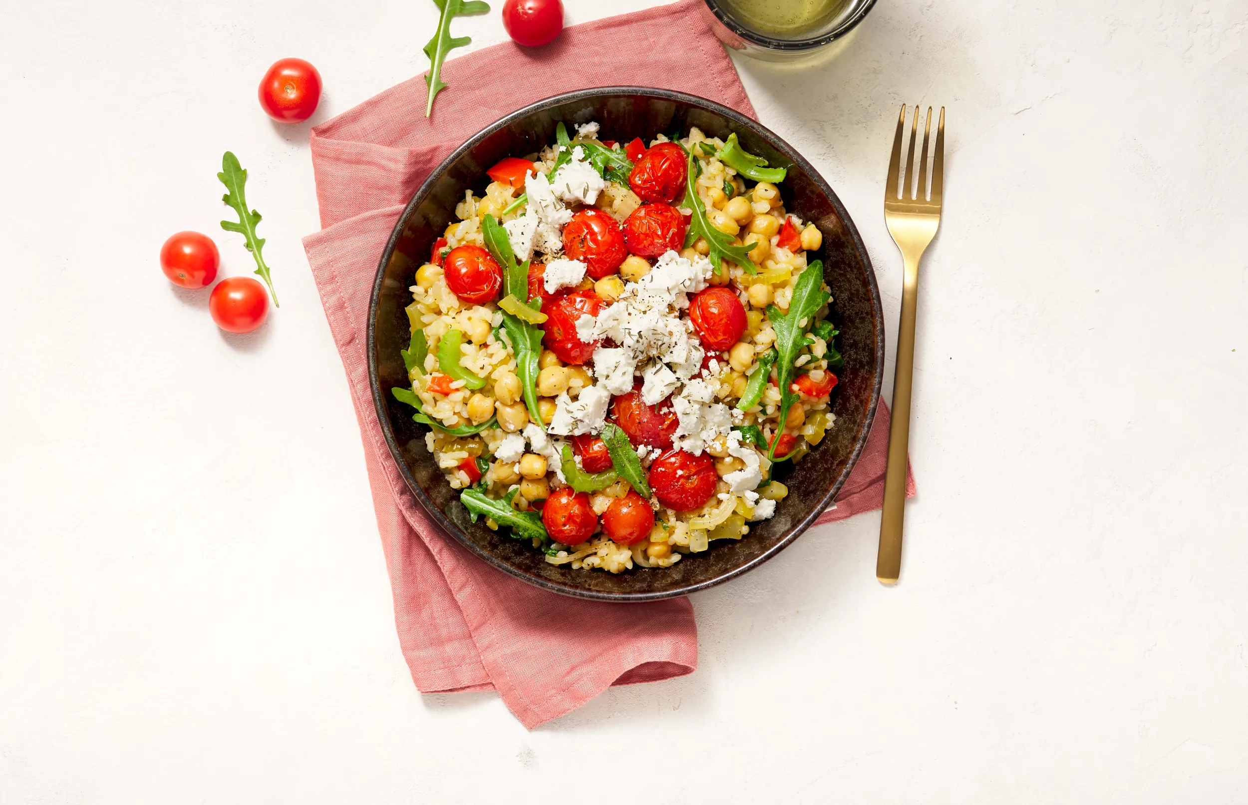 Risotto met paprika, kikkererwt, geroosterde tomaatjes en feta